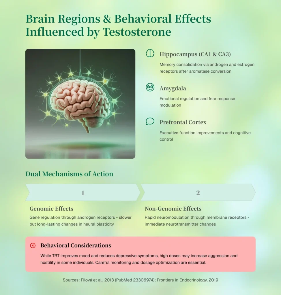 Testosterone interacts with androgen receptors throughout the brain. These receptors trigger gene expression changes that influence cognitive function, mood, and stress responses.